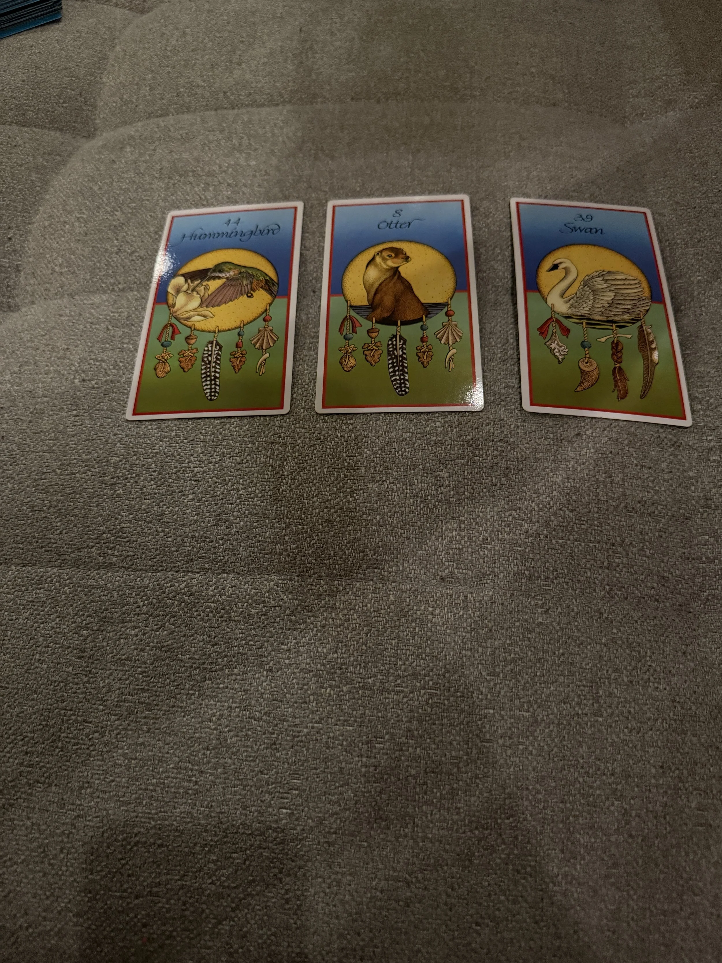 The first card drawn was a hummingbird with the number 44–the number 44 drawn on my birthday. I learned that the hummingbird represents joy, which was the topic of a partner conversation earlier in the day during our hike.