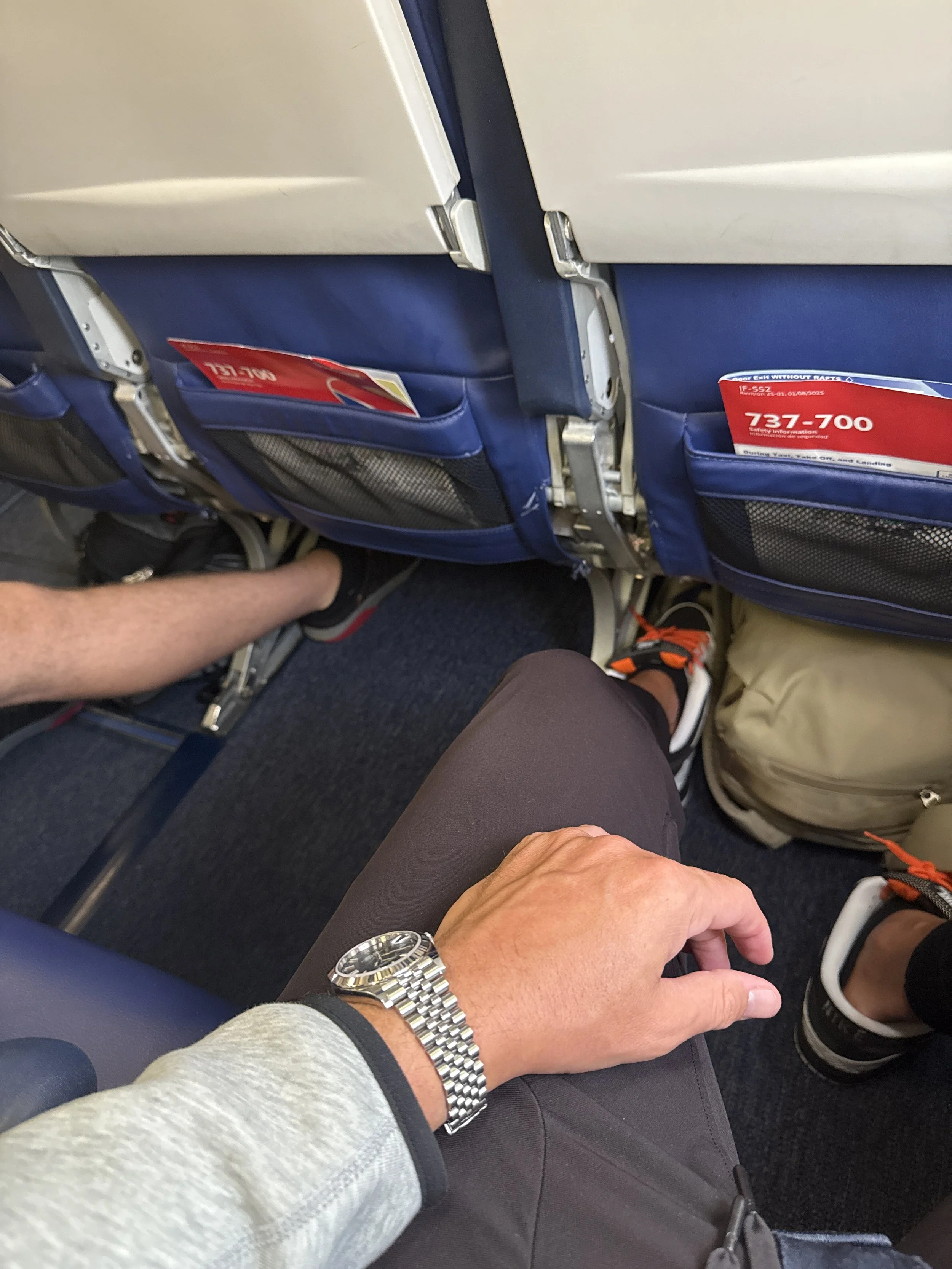 Southwest’s open seating policy was kind to me in that I was able to snag an exit row seat—extra leg room for the win. But that’s not all, the middle seat in my row remained open as well. Not only did I get extra leg room, but I also got extra arm room.